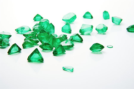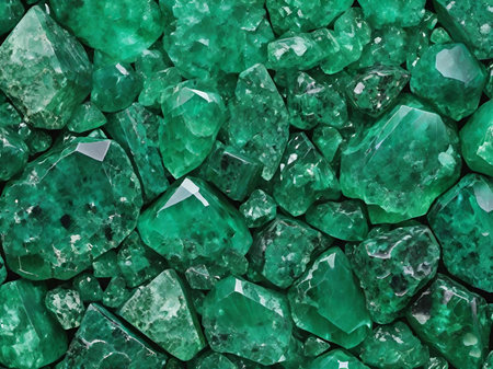 This image showcases a collection of vivid green crystals, displaying intricate facets and textures. The composition appears to be a close-up, possibly shot in a studio setting with a focus on detail. The crystals' color and the lighting suggest potential use in commercial projects or editorial illustrations, conveying an image of beauty and value.