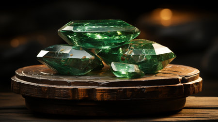 Three Green Emeralds Sitting On Top Of A Wooden Table. Generative AI