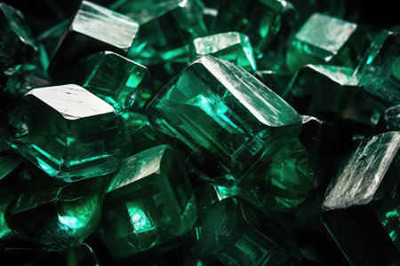 This image showcases a collection of brilliant green crystals. Their surfaces gleam with reflective facets, highlighting geometric structures. The close-up perspective emphasizes the crystalline textures and vibrant coloration, set against a dark, contrasting backdrop. Suitable for illustrating concepts related to geology, gemstones, or design, this image offers potential for various creative projects.