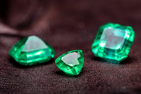 Emerald gemstones are showcased in this image, illuminated against a dark backdrop. The visual characteristics include a rich green color, with each stone presenting a multifaceted structure and reflective qualities. The lighting suggests an indoor setting, and the composition is suitable for editorial or commercial applications.
