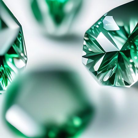 This image showcases a collection of vibrant green gemstones, appearing polished and reflective. The composition emphasizes the facets and brilliance of the objects, with light playing across their surfaces. Suitable for various applications, including advertising, design projects, and illustrating concepts related to wealth and value.
