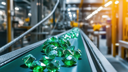 A visually captivating scene featuring emerald crystals moving along a conveyor belt in a contemporary industrial setting. The soft lighting highlights the vibrant green hues of the gems, showcasing the intricate details of each facet as they sparkle in a modern production line.