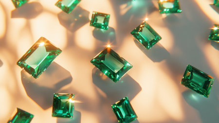Baguette-cut emeralds scattered on soft cream background with glowing reflections