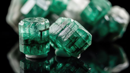 This image showcases a collection of vivid green emerald crystals. The gemstones are presented against a dark, reflective backdrop, enhancing their brilliance. The composition highlights the geometric forms and internal textures. Suitable for commercial applications such as advertising and editorial content.