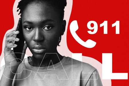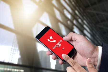 Woman hand holding smartphone against blur bokeh of building background 911 Emergency concept