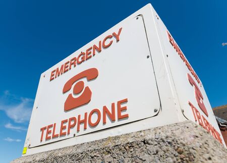 An retro old weathered and distressed emergency telephone sign, on a rustic seaside wall near the ocean and swimmers. The sign is old and vintage.