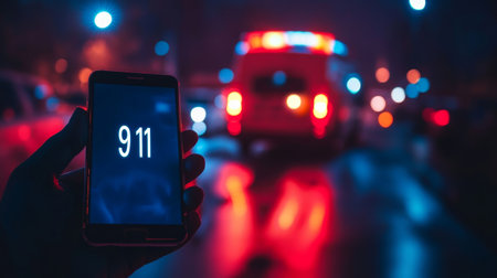 Emergency call made from a smartphone with flashing lights of an ambulance in the background at night
