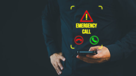 Man holding smartphone with glowing emergency call icons, representing urgent help, safety alert, medical assistance, accident response, and fast communication in critical situations.