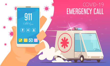 Medicine hygiene virus coronavirus composition with palm smartphone calling 911 and ambulance driving fast to rescue vector illustration