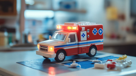 A red and white toy ambulance with flashing lights, placed on a table with a miniature hospital backdrop