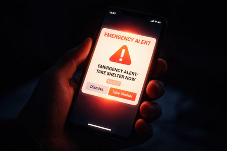 A hand holds a smartphone displaying an emergency alert that advises to take shelter now due to a serious situation requiring immediate action.