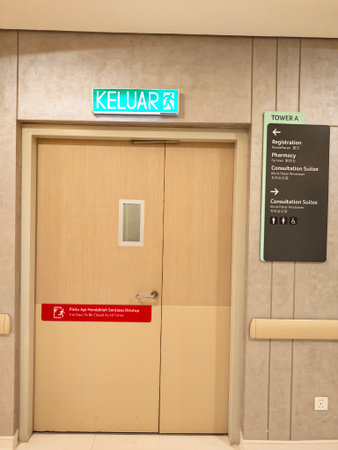 Hospital emergency exit with multilingual signage and directory for Tower A departments.