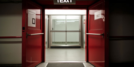 An isolation ward door with illuminated medical cross sign and dramatic spotlight sterile corridor, moody emergency entrance conveying tension