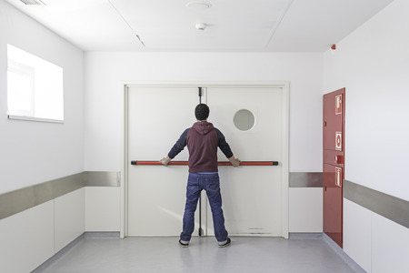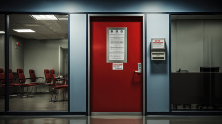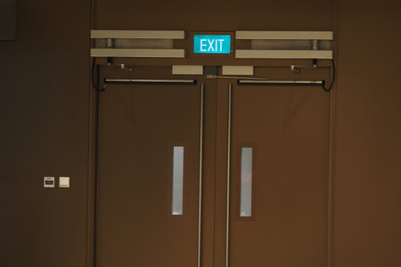 Fire exit door. Fire exit emergency door red color metal material with alarm and emergency light and fire extinguish equipment on building wall for safety protection. Doors for escape conflagration.