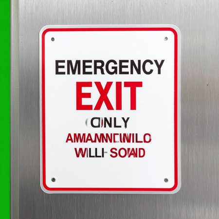 A close-up of a standard emergency exit sign with a humorous twist. Below the clear, bold words 'EMERGENCY EXIT', a line of nonsensical, garbled text creates a sense of absurdity and confusion.
