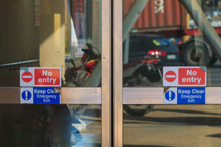 Sign on door NO ENTRY, KEEP CLEAR EMERGENCY EXIT, reflection on glass