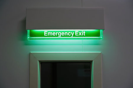 Green illuminated emergency exit sign glowing above a door frame in a dark corridor.