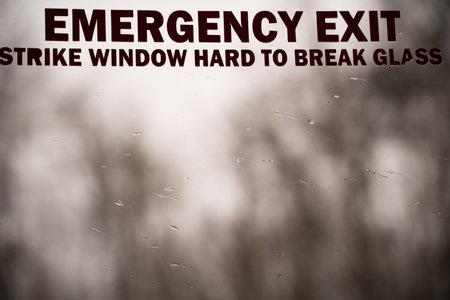 City, travel and window of bus, emergency exit and safety in public transport, empty and information. Commuting, precaution and guide for escape from vehicle, glass and words for regulations on trip
