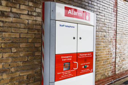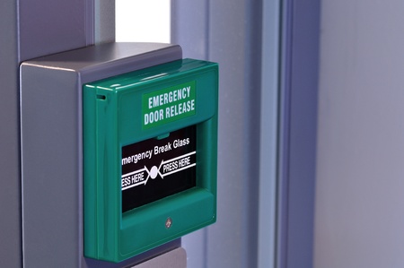 An emergency stop button is placed on a glass wall in a public space for safety measures