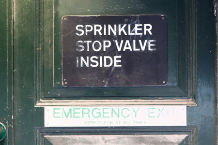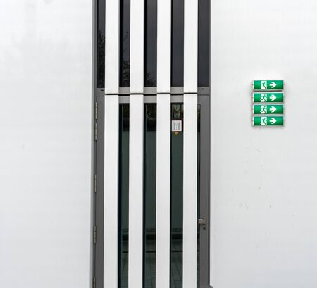 Green emergency exit sign over white door with red fire hydrant department connection on gray aluminum composite tile wall outside of building in vertical frame
