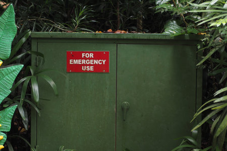 Close up of the door of the life jacket compartment room on a passenger ferryboat in Canada. White aged surface with signs with explicative icons.