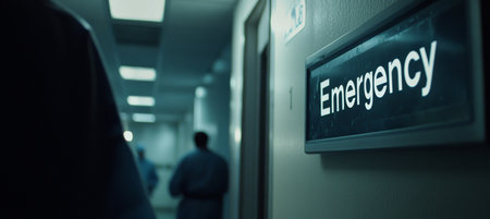 Red Emergency Sign on a White Wall, with a Blurred Hospital Corridor in the Background.
