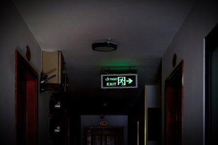 Illuminated green light emergency exit sign in public building for emergency accident and fire case