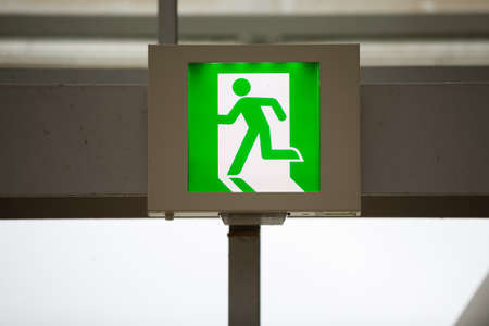 Illuminated green light emergency exit sign in public building for emergency accident and fire case