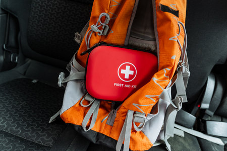 An individual is carefully placing a first aid kit inside a backpack as part of their preparation for a journey or outdoor activity, ensuring they are equipped for any potential emergencies