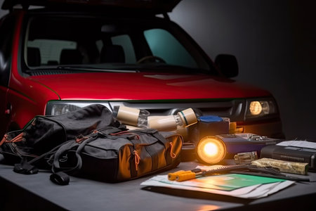 First aid kit an open red first aid kit bag with a black zip and handle, in closeup. and handle in closeup in an open fire truck