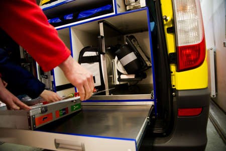 Paramedic gets his Expired Air Resuscitation from the back of emergency vehicle with open door and equipment inside. EMS