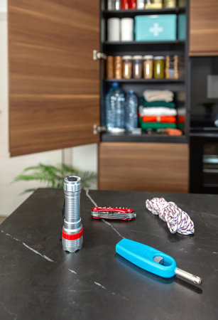 Emergency kit on kitchen counter with multitool knife, lighter, flashlight and rope ensuring safety during natural disasters or war. 72 hour survival supplies stored in pantry closet on background.