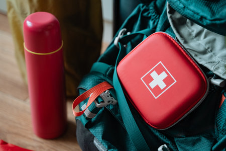 A wellprepared first aid kit is securely placed on a sturdy backpack, ensuring it is easily accessible during outdoor activities, trips, or even daily use in the event of unforeseen emergencies