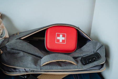 A bright red first aid kit in a backpack of casual clothing highlights the importance of safety and preparedness for emergencies during travel or unexpected situations needing quick intervention
