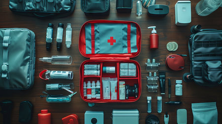 A modern first aid kit opened, displaying various medications and supplies for emergency care. organized layout ensures quick access to essential items..