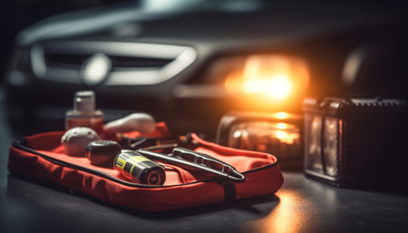 car first aid kit, suitcase with medical supplies illustration. Generative AI.