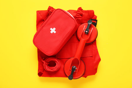 An organized first aid kit displays essential medical supplies ready for emergencies, featuring dressing, bandages, and tools crucial for immediate healthcare and injury management.
