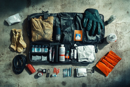 Flat lay of carefully organized emergency backpack items, showcasing survival gear, medical supplies, and essential tools for safety and preparedness.