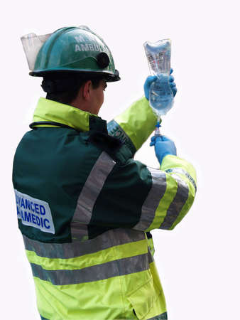 Paramedic in orange uniform performing resuscitation procedure.