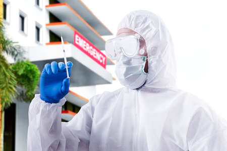 Health worker man with a protective suit and gloves holding syringe on the hospital