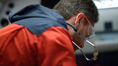 Team of paramedics in gloves performing first aid procedure in emergency vehicle. Closeup emergency doctor hands taking off neck collar from man. Medic examining victim head after car accident