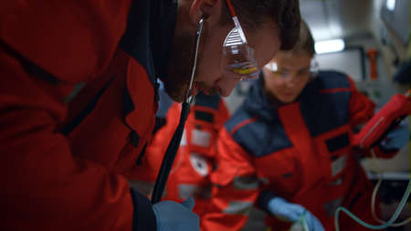 Paramedics team examining patient with stethoscope in emergency car. Medical staff using medical equipment. Health care professionals giving first aid help to man after car accident. Urgent help