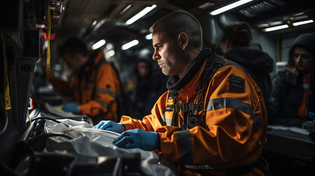 Emergency medical team assists an injured man in an ambulance during a night shift in a city setting. Generative AI