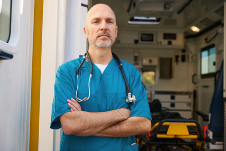Medical officer with stethoscope around neck stands near an ambulance