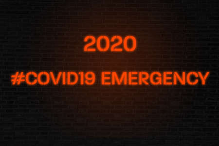 Covid19 hastag emergency in neon style on brick wall background and orange glow