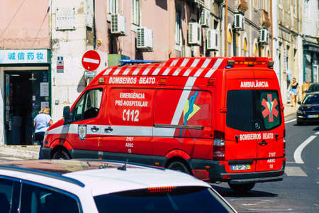 Lisbon Portugal july 28, 2020 View of a traditional ambulance rolling fast through the streets of Lisbon, the hilly coastal capital city of Portugal and one of the oldest cities in Europe
