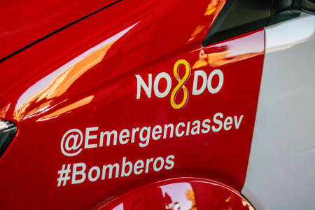Seville Spain September 22, 2021 Fire engine rolling in the streets of Seville, an emblematic city and the capital of the region of Andalusia during the coronavirus pandemic affecting Spain