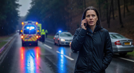 Young woman in raincoat talking on mobile phone with ambulance car in background