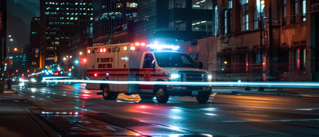 Big special blurred ambulance car races through bustling streets of City, beacon of hope and help in times of need.