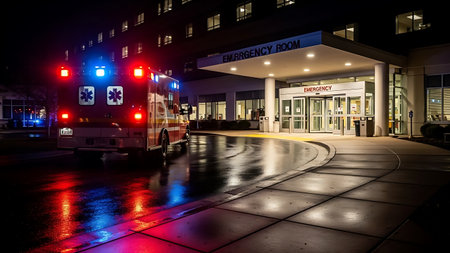 Ambulance in front of the entrance to the building at night